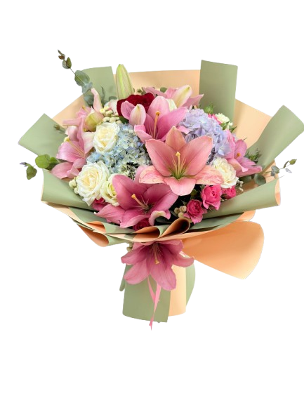 vip ürün ortanca ve pembe lilyum tasarım buket